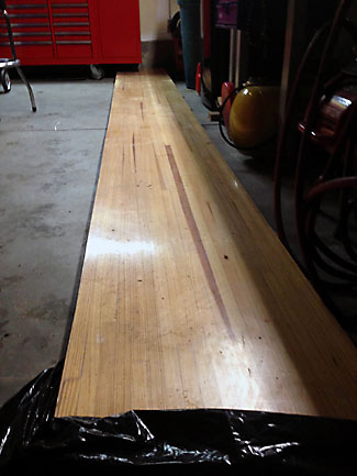 The steel cradle was built in AZ and the recycled bowling alley board was cut down and re-conditioned in Colorado. The steel cradle was delivered to Colorado and assembled on site. Not all complete at the time of these pictures - carpet needs piping and lights installed, but it plays like a new one for now.